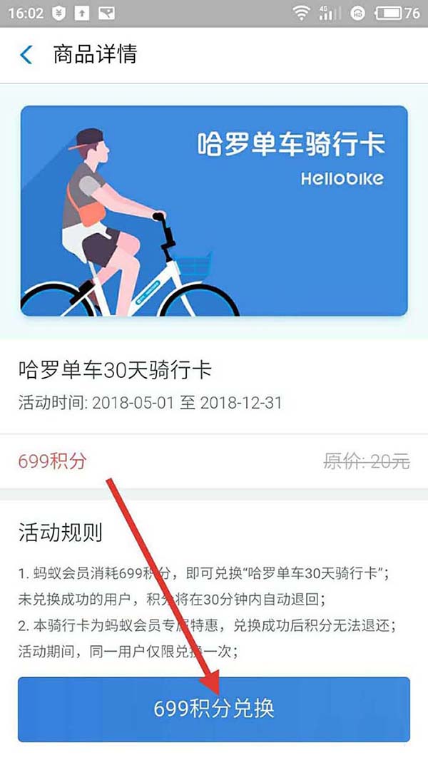 4、在商品详情页面,699积分可以兑换一个月哈罗单车的免费骑行,点击“699积分兑换”,如下图所示: