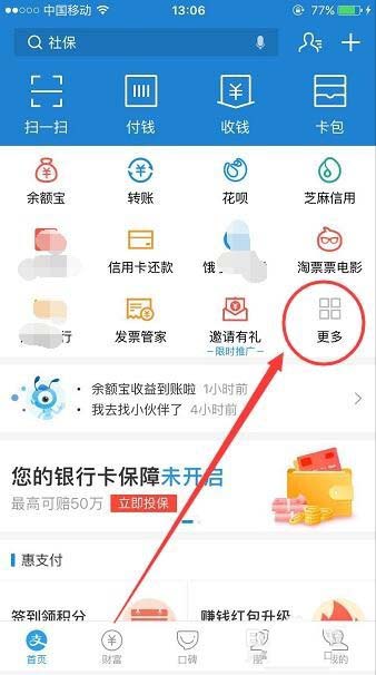 1、打开手机支付宝首页,在应用功能的右下角有一个更多