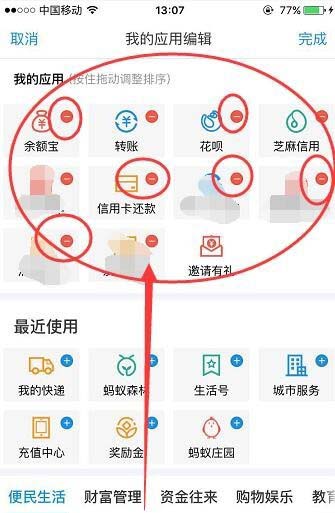 7、点开编辑之后,我的应用里面的所有应用功能就会出现一个红色的减号,把不要的应该点击减号删除就可以。