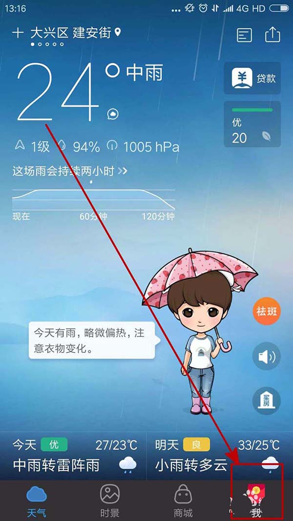 1、我们进入墨迹天气之后可以看到当前的天气状况,我么点击右下角的“我”按钮。