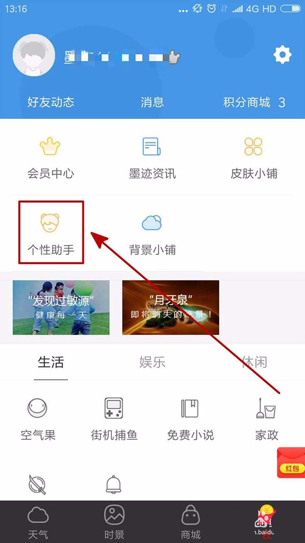 2、进入我的墨迹天气之后,我们可以看到自己的墨迹天气账号信息,我们点击下方的“个性助手”。