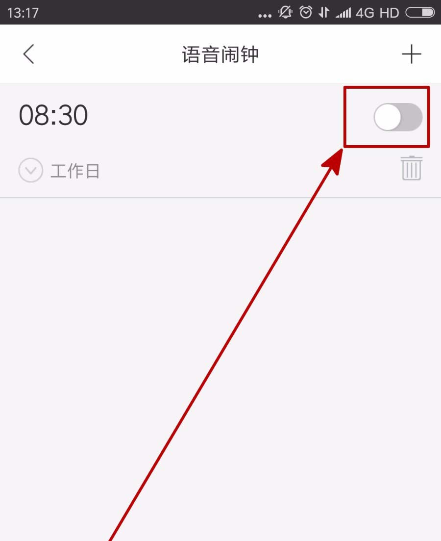5、进入语音闹钟界面后,我们可以看到一个默认的闹钟,我们点击这个闹钟的开关,或者直接点击右上角的加号重新添加闹钟。