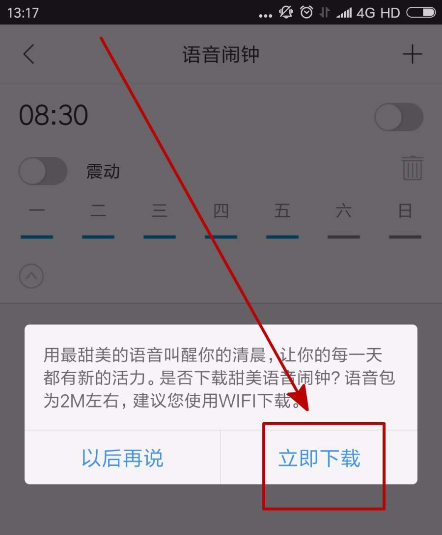 6、如果是第一次使用墨迹天气语音闹钟的话需要下载一个语音包,大小大概在2M,很快就能够下好。