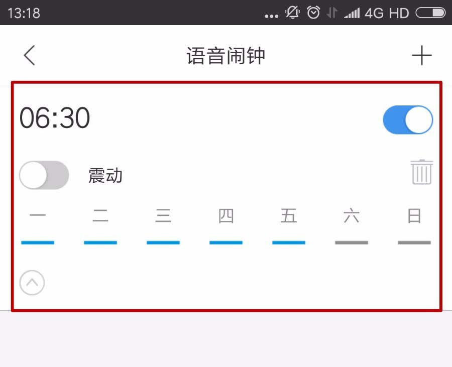 9、我们在语音闹钟界面可以看到设置的这个闹钟,我们点击右上角的加号可以继续按照这个方法添加闹钟。