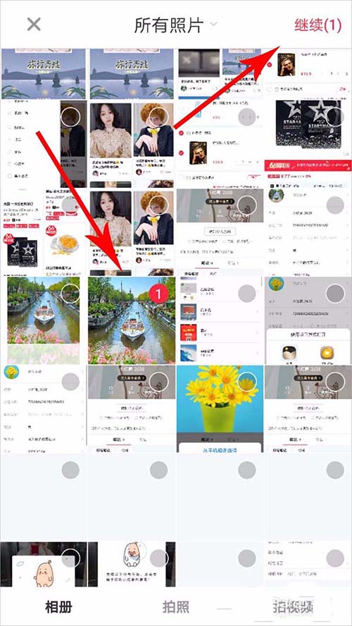1、开始发布一篇图片笔记。点击页面底部的红圈开始发布笔记,在打开的图库中选择一张图片,接着点击页面右上角的“继续”按钮。