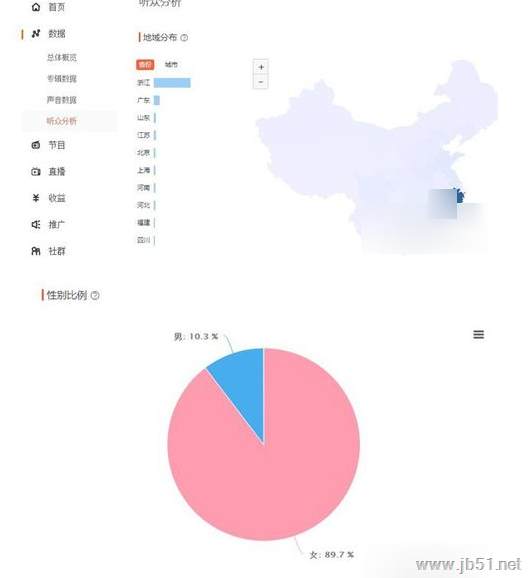 6.点击听众分析可以看到听众的区域分布和性别比例。