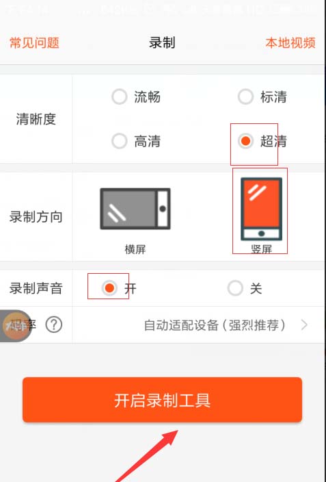 点击启动软件后,开启录制的内容,是横屏还是竖排,然后是录制音频开关也开启。
