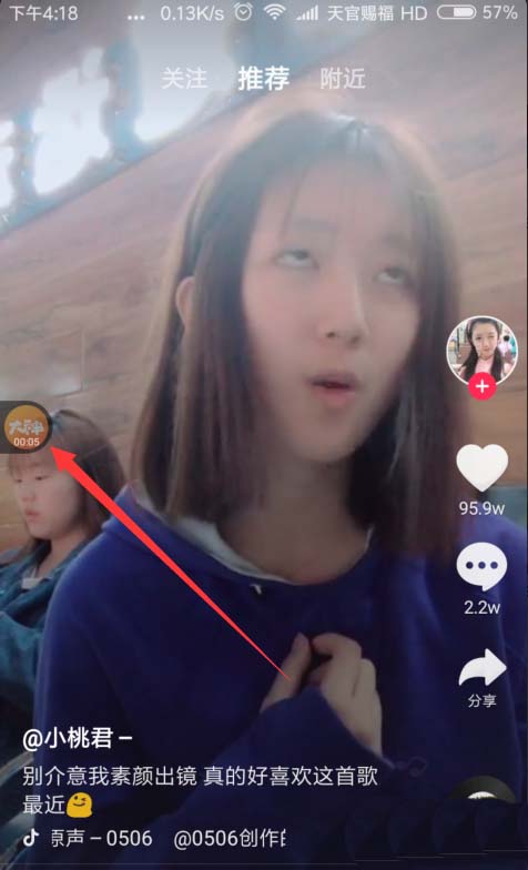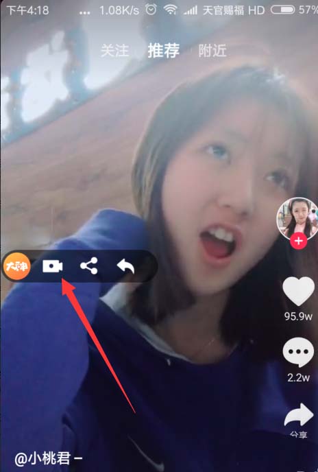 3、然后退出这个录屏软件,启动手机上安装的抖音APP,如图所示,在上方有一个悬浮的录制按钮,点击一下。开始录制视频。