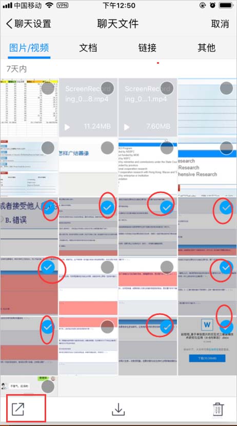 5、点击下图中的圆形灰色选择框,进行文件的多选。再点击页面左下角的分享按钮