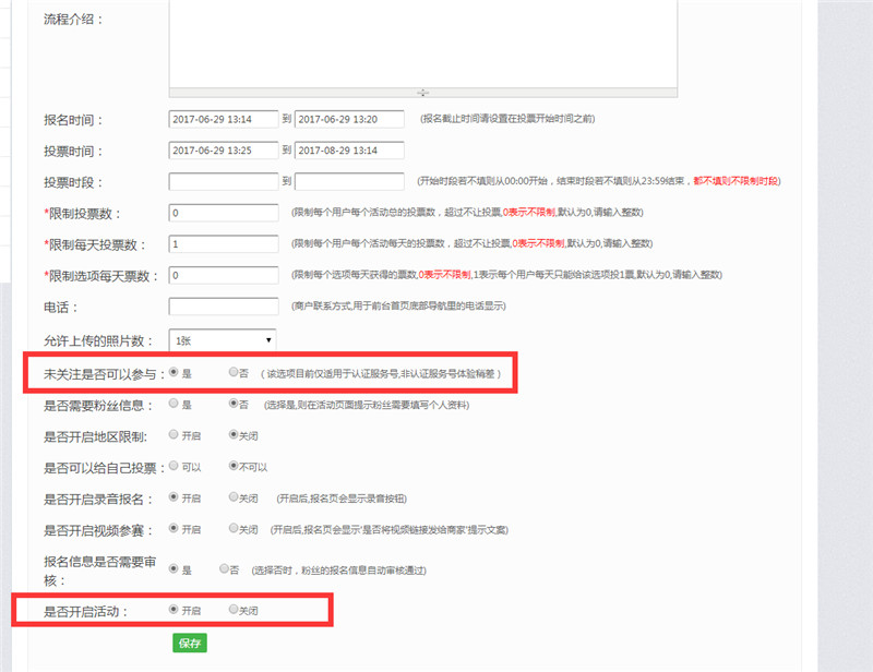 3.限制每天投票数,就是每天可以投票的数量;限制选项每天票数,就是每个投票选项每天能收到的票数;报名信息是否需要审核,建议开启,下边的选项可以根据自己的需求进行勾选就可以的,,保存下一步
