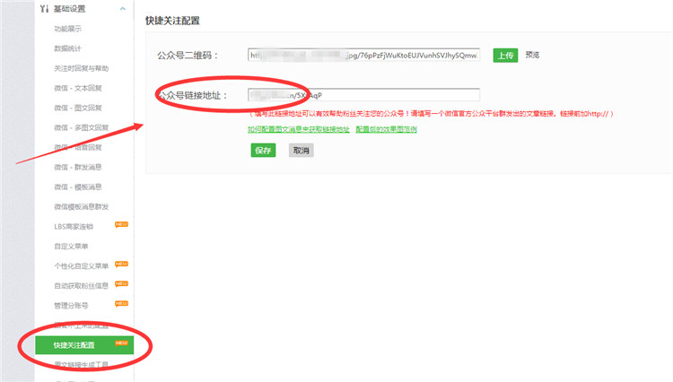 第二步:管理中心-功能管理,进到制作后台,点击左侧自动获取粉丝信息,选择获取昵称头像信息,保存;然后左侧--快捷关注配置,填写关注链接,关注链接可以从公众平台里复制群发过的图文链接,保存.