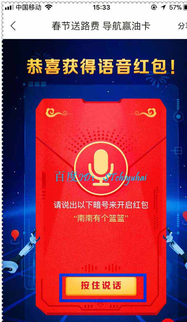 3、不同的红包有不同的任务,任务主要有三类,一个是读一段红包暗号、一类是自拍一个笑容,还有一个就是导航任务。
