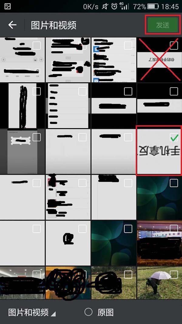 8、找到你编辑好的图片,找到的图片一定要是全屏的,打X的那个不是全屏的,不要选,选下面打勾的才是,点击发送: