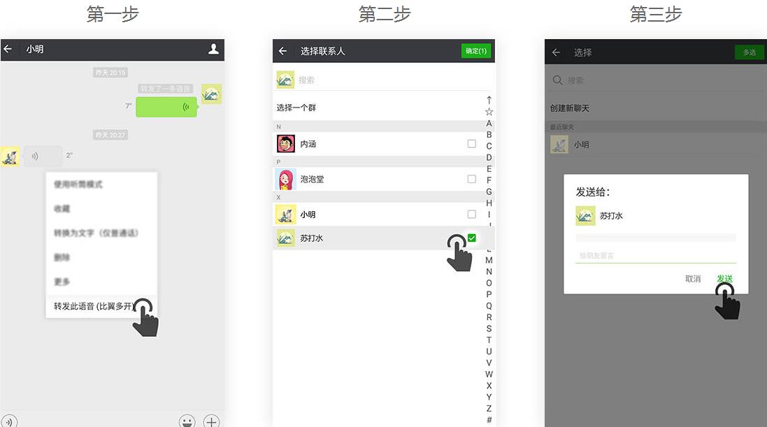 功能说明:免root语音消息一键转发,不用再为传话感到麻烦,打开开关,长按语音消息就可直接转发