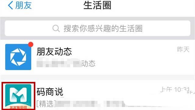 4、点击生活圈中的“码商说”生活圈,进入查看。如果还没有关注“码商说”生活圈的小伙伴可以通过搜索来加入。