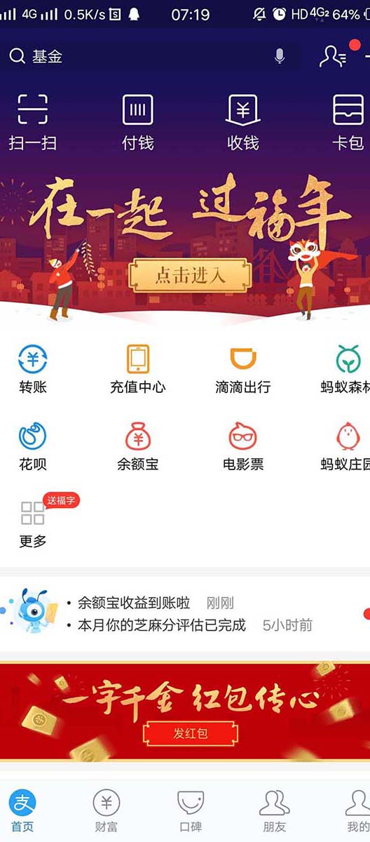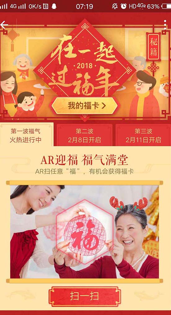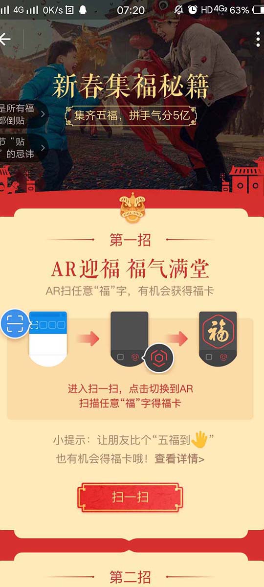 一、保留支付宝AR扫“福”字,扫任何一个福字都能扫到福到。另外,今年AR扫“福”字增加一个彩蛋,即让朋友摆“五福到”手势也有机会得福卡,或将手机相机设置到前置摄像头,并拍摄摆出的“五福到”手势。