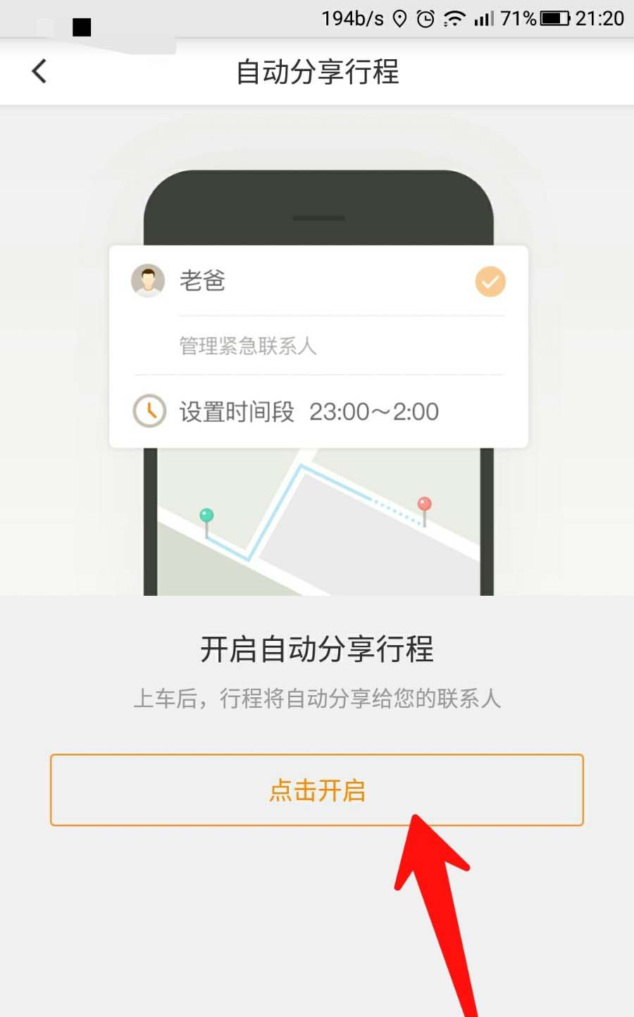5、然后在图示位置中,点击“点击开启”,去开启分享行程功能。
