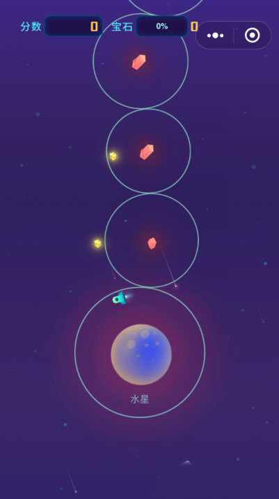游戏进去是有一个一个的小圆圈,我们要在接缝的地方进行点击,过度到下一个圈,里面会有各种各样的星球,我们通过不断的过度,不断的穿越一个又一个的星球。