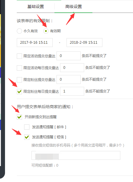 4.高级设置页面,勾选报名活动的有效期,对总的或者每天的提交量做限制,还可以选择邮件或短信的方式提醒.