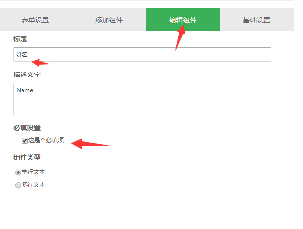 6.编辑组件选项,点一下右侧就出现编辑区域了,分别设置标题、描述文字和勾选是否必填,将添加的组件全部编辑好以后保存
