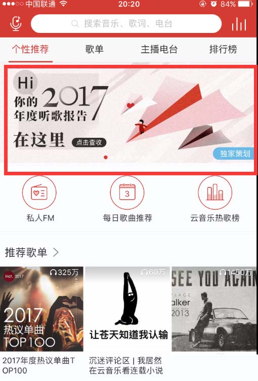2、如图,在网易云音乐首页,在屏幕上部分,找到2017年度听歌报告,点击进入