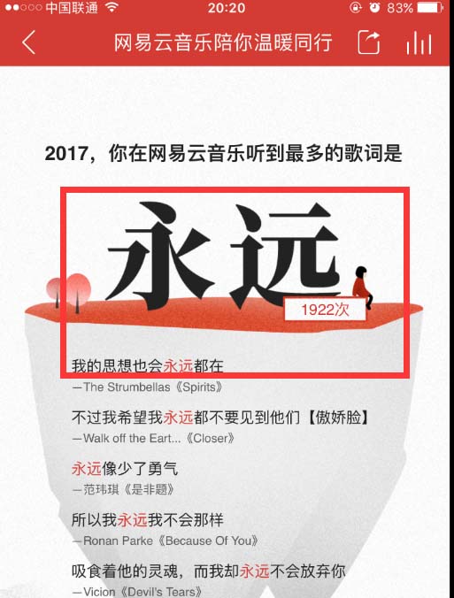 5、往上滑动界面,还可以查看听到的最多的歌词,比如小编的是“永远”