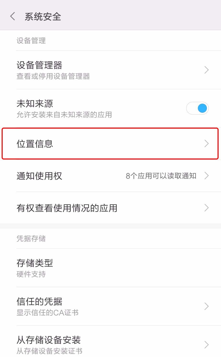3、在“系统安全”里打开【位置信息】,【开启位置服务】默认选择【仅限设备】“使用GPS确定位置”,其他选项看自己的需要吧。