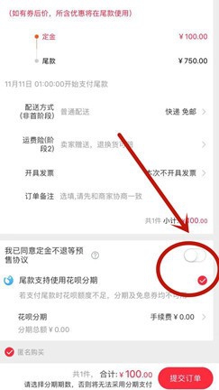 3、然后我们会看到如下图的界面,将页面滑到最底部,将“我已同意定金不退等预售协议”打开,并将“尾款支持使用花呗分期”打钩,之后提交订单。