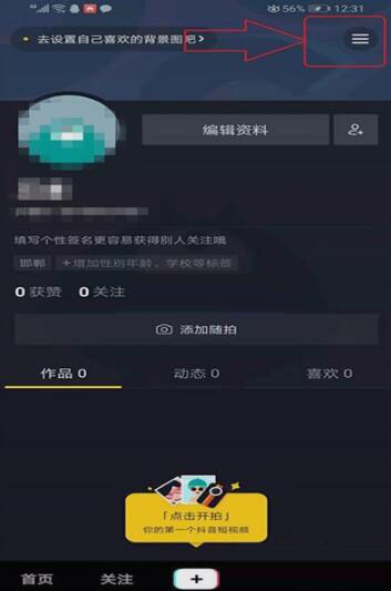 2登录成功后,进入到个人主页,点击右上角的三个并列的短横线标志。