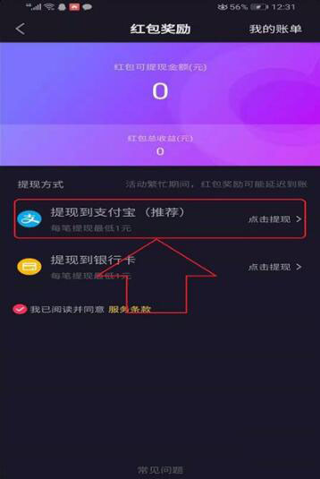 4点【红包奖励】之后,就会显示出两种提现的方式,点第一种【提现到支付宝】后面的四个小字【点击提现】。
