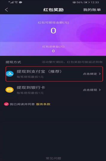 8再回到【红包奖励】的页面,此时就可以看到提现方式的第一项提现到支付宝后面,不再是【点击提现】,而是【点击绑定】,说明已经解除了支付宝绑定。