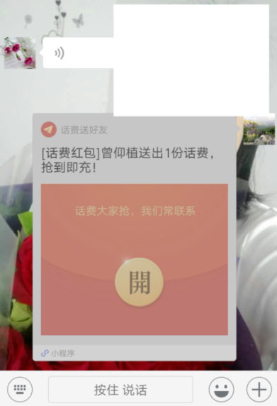8.与好友的聊天界面就会显示话费红包了,打开就能领取,如图