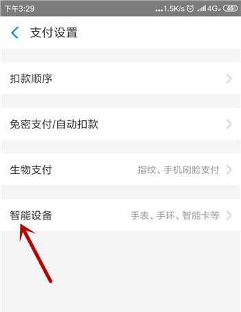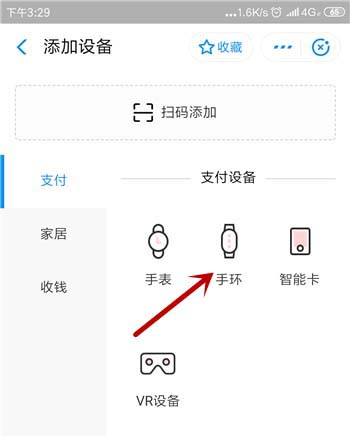 6、然后在添加设置界面的支付分类下选择【手环】设备。