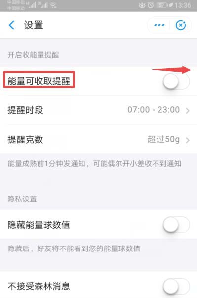 5、之后将能量可收取提醒的开关向右滑动;