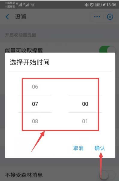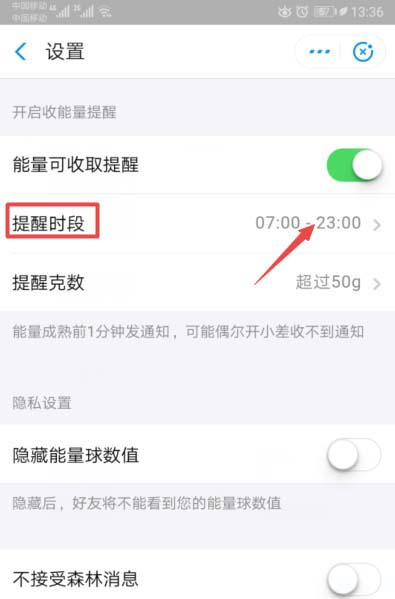 6、滑动完成后,我们也就打开了能量收取提醒了,之后点击提醒时段后面的时间段;