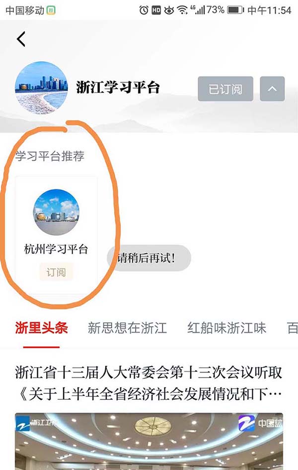 6、点击一下下拉键会出现一个学习强国号推荐,可以看见下面有一个“杭州学习平台”,点击杭州学习平台下方的订阅,就成功订阅一个了。