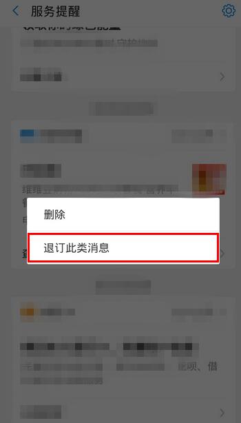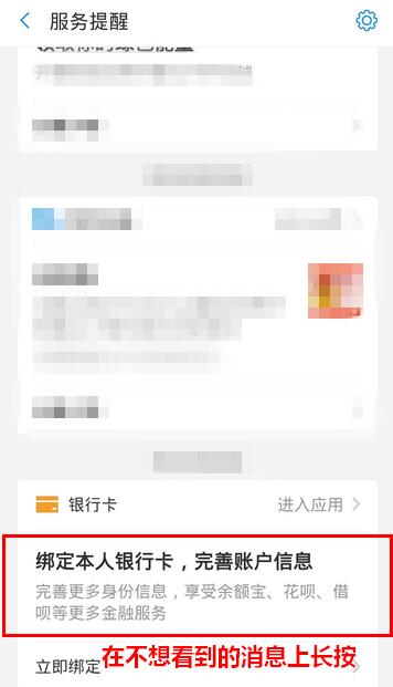 进入服务提醒界面,找到你不想看到的消息,长按该消息,