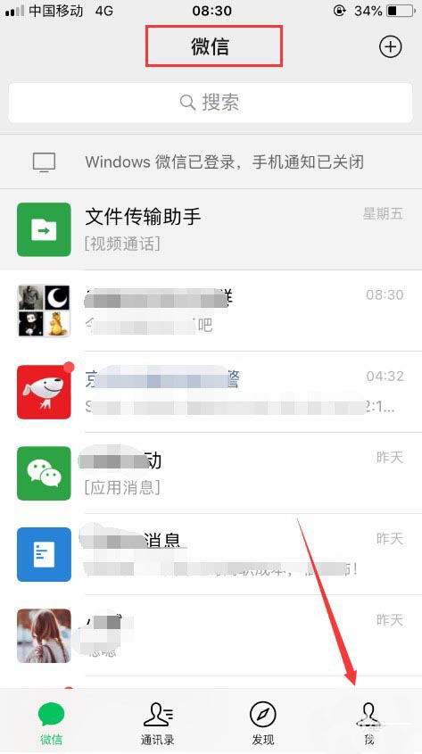 1、我们在使用微信时,可以发现,微信主面板上面默认的字是中文“微信”,如下图。想要改为“WeChat”,可以打开登录微信后,进入之后点击右下角的“我”,如图所示。
