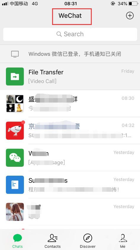 7、设置完成之后,再次回到微信主界面,就可以看到,显示的名称已经变为“WeChat”,如图所示。