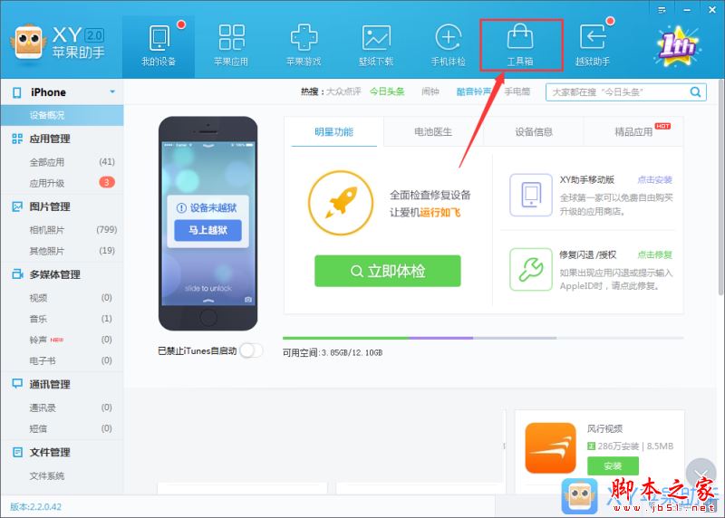 首先下载最新版本XY苹果助手PC客户端之后,连接自己的iPhone并点击上面的“工具箱”按钮。
