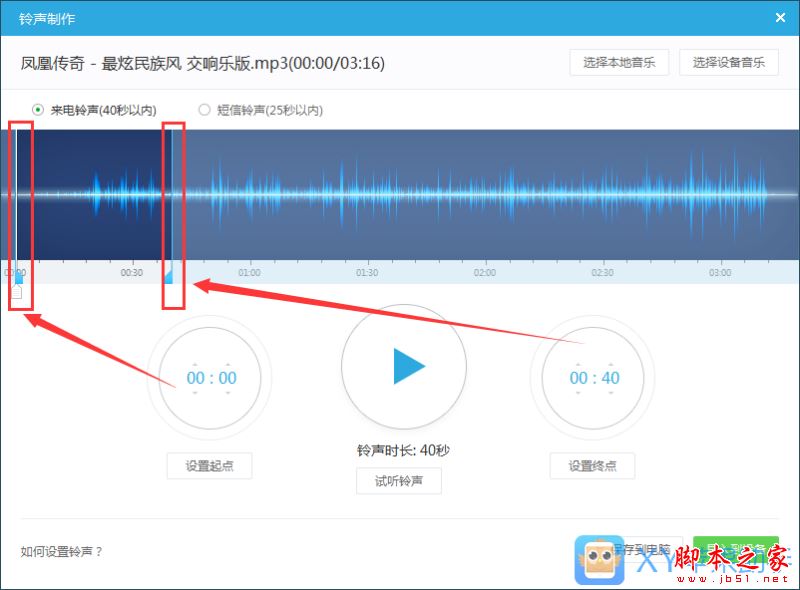 我们导入好音乐后,在铃声制作界面可以选择铃声的起始和结束时间,毕竟我们不可能用一首歌全部的时间都作为铃声嘛。你可以选择拖动两个选框和输入时间两种方式来设定时间。