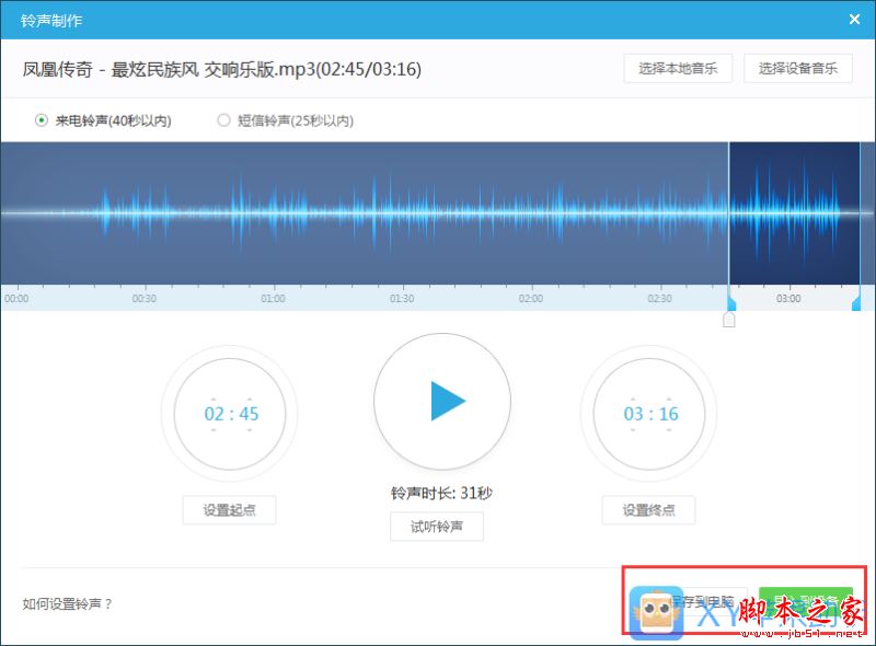 最后我们设定完成之后点击“试听铃声”可以听一下是否合适。合适的话,可以选择保存到电脑或导入到设备。小编建议直接导入到设备,这样就可以马上体验用自己喜欢的音乐来做铃声咯,是不是很方便呢!