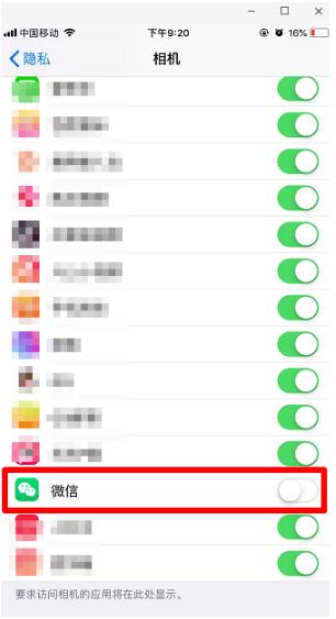 这里的微信是关闭的,即不允许微信使用相机,所以微信扫一扫会变成黑屏,点击微信右侧按钮打开就可以了。