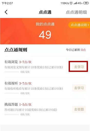 3、然后在获得点点通里就可以看到有哪些方法可以获得点点通了,主要是通过看图文、视频以及答题来获得点点通,比如我们以图文后为例,点击【去学习】。