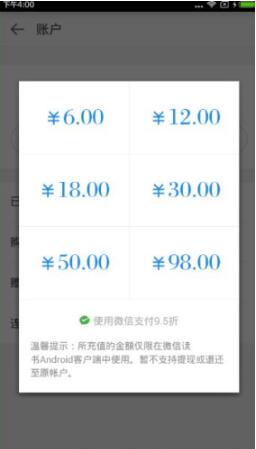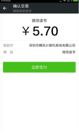 第四步:用微信支付可以享受9.5折,也还是不错的,毕竟充的多省的也多,点击立即支付即可开始畅读。