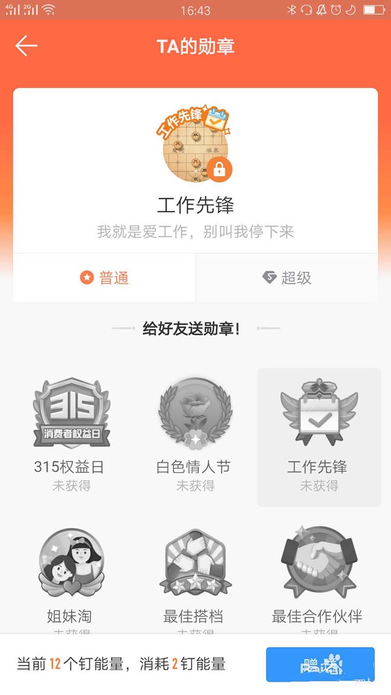 7、按下要赠送的勋章,按下赠送就可以了,注意这个需要钉能量,看图