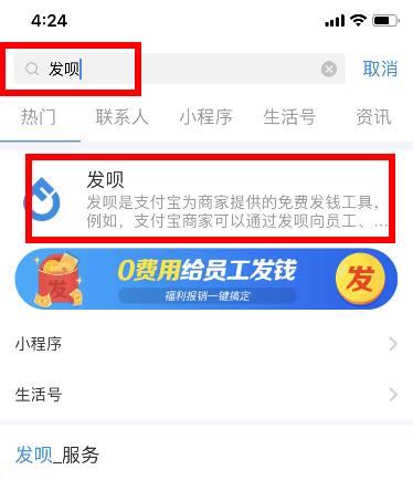 首先打开支付宝APP-搜索“发呗”即可看到