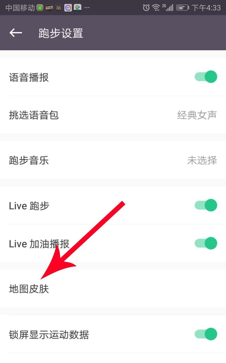 2、打开“跑步设置”界面后点击“地图皮肤”