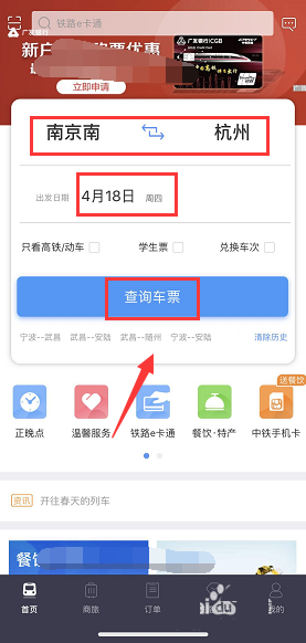 2、登陆后,首页选择你的车票起始站和时间,点击查询车票,如下图所示