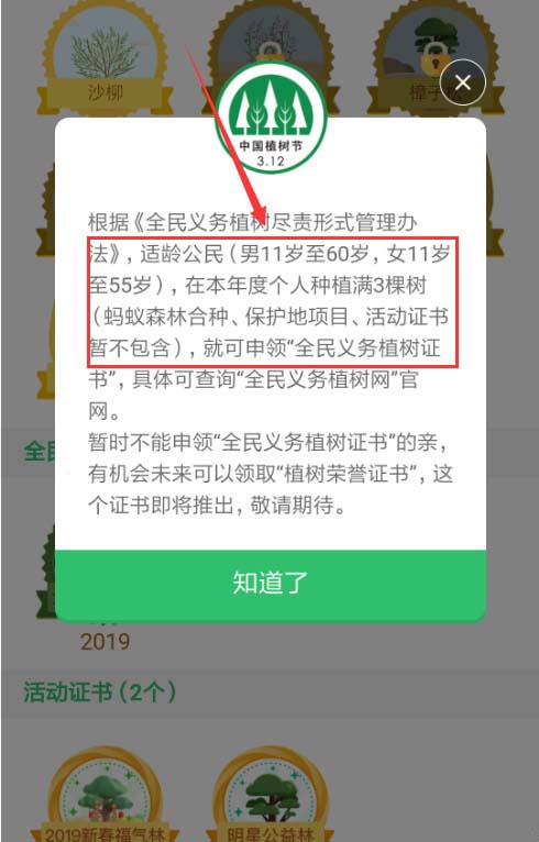 4、在页面的下方如图位置,就可以找到“全民义务植树证书”,如未获取就是带锁状态,点击一下可以获知该证书的获取条件:适龄公民在本年度个人种植满3棵树就可以申领该证书。